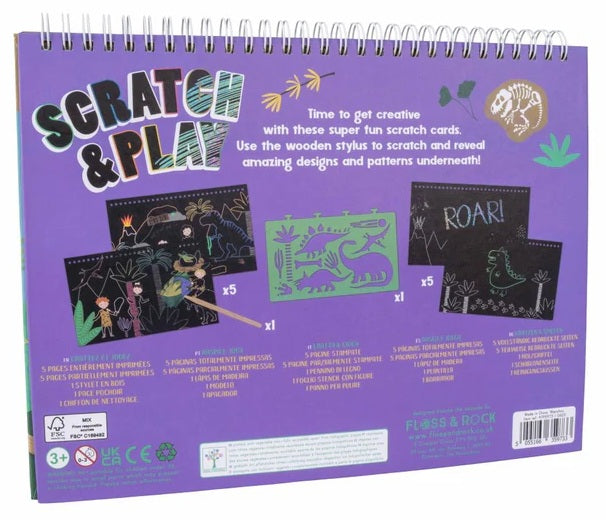 Embark on a journey back in time with Floss & Rock Scratch & Play - Dinosaur. This set is perfect for young paleontologists and creative minds, offering an exciting way to explore art and dinosaurs simultaneously. Using the wooden stylus included, children can scratch away at the 10 pre-printed cards to reveal stunning designs and patterns of the majestic creatures that once roamed the Earth.