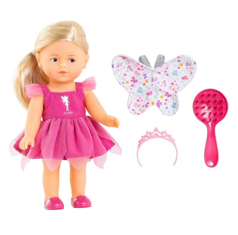 This set includes a small, 20cm doll, ready to give as a gift, and three accessories. Rosy, a small doll with white skin, has a soft vinyl body with a delicate vanilla scent. Her blue eyes are painted on her face. She has long, silky blonde hair that is easy to style.