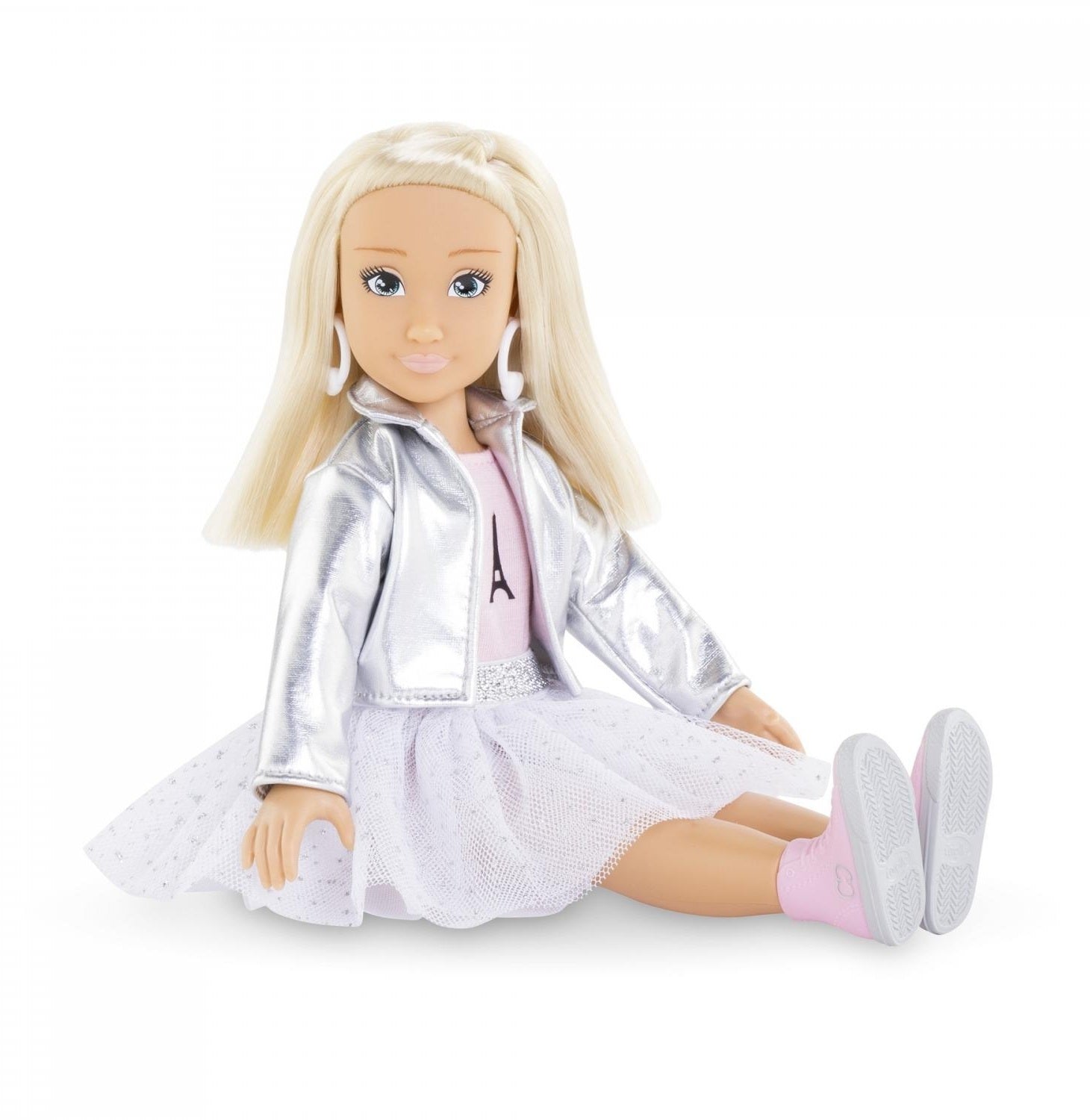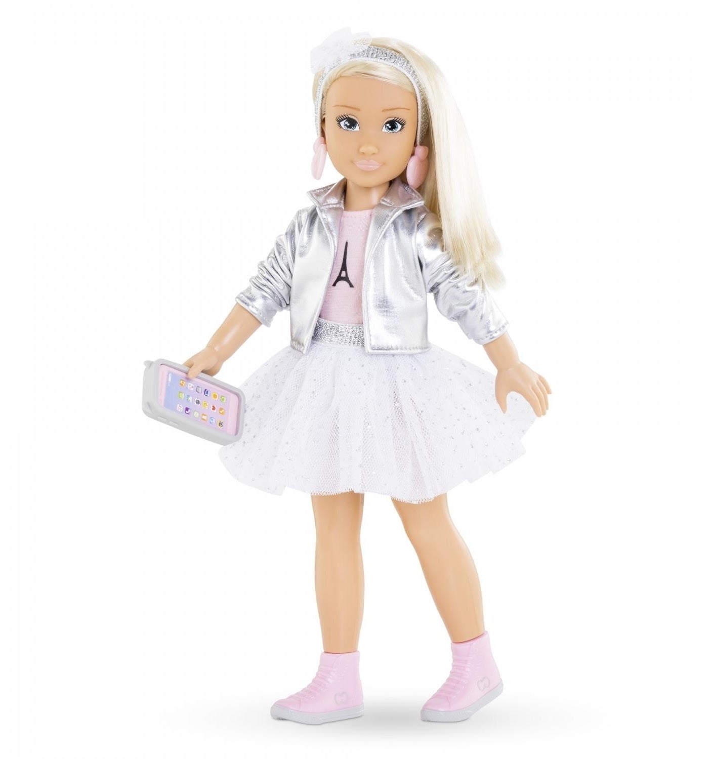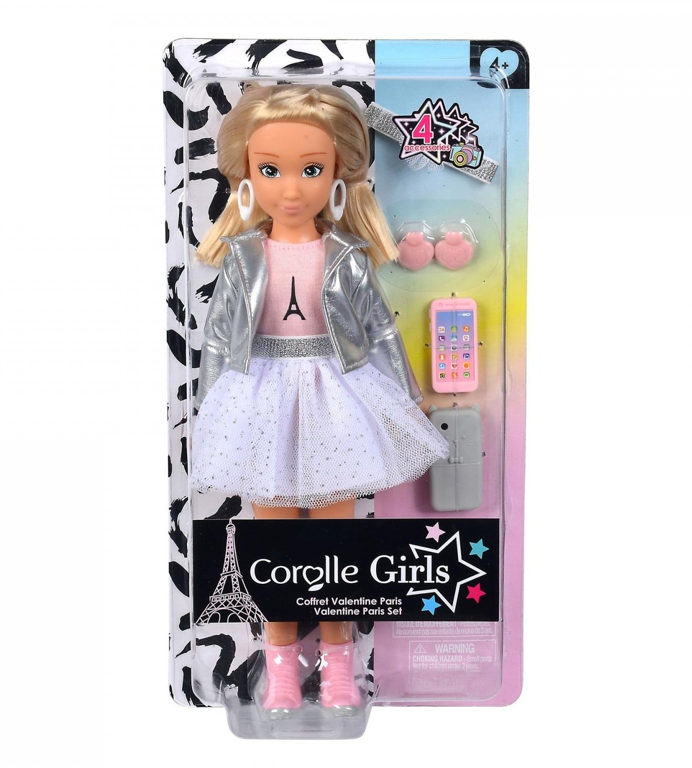 The Valentine Fashion Week Paris boxed set includes Valentine, an 11-inch fashion doll and 4 accessories: one pair of removable earrings, a cell phone, a cell phone case and a headband. Valentine has a lovely, fine-featured vinyl face that is delicately scented with vanilla, painted eyes and shoulder-length blond hair. She's wearing a white tulle skirt, a pink T-shirt, a jacket, pink removable ankle boots, and removable earrings. Valentine is able to sit and to stand alone. The Corolle Girls Collection includes multiple sets and accessory outfits for even more creative play possibilities. Ages 4 and up.