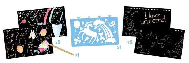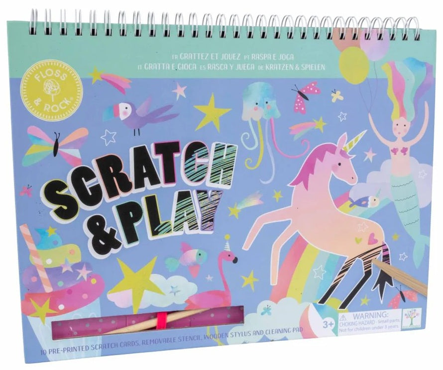 Let imagination soar with the Floss & Rock Scratch & Play – Fantasy. This bewitching set is a treasure trove for young artists who dream of fantastical realms and mythical creatures. It features 10 pre-printed scratch cards that, when brushed with the wooden stylus, reveal stunning fantasy-themed designs and patterns hidden beneath.