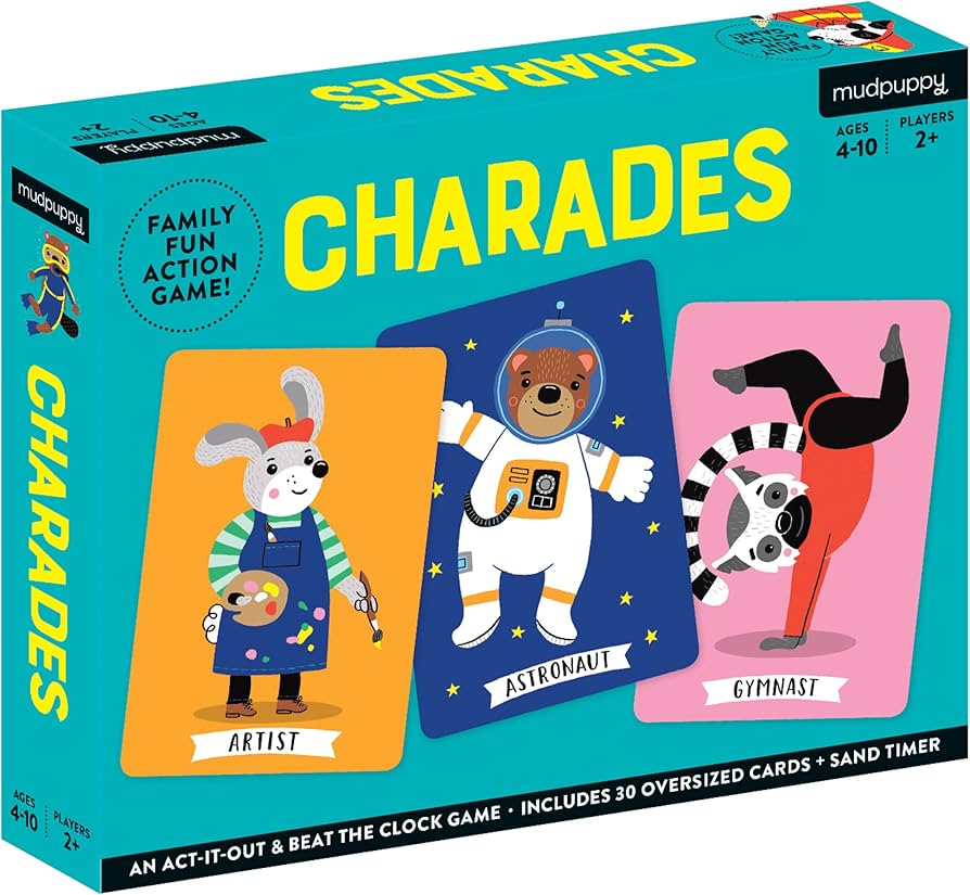 Children and families can enjoy the classic game of Charades. Mudpuppy Charades includes 30 cards and a timer for 2 or more players to act out, beat the clock, and win! Ā
