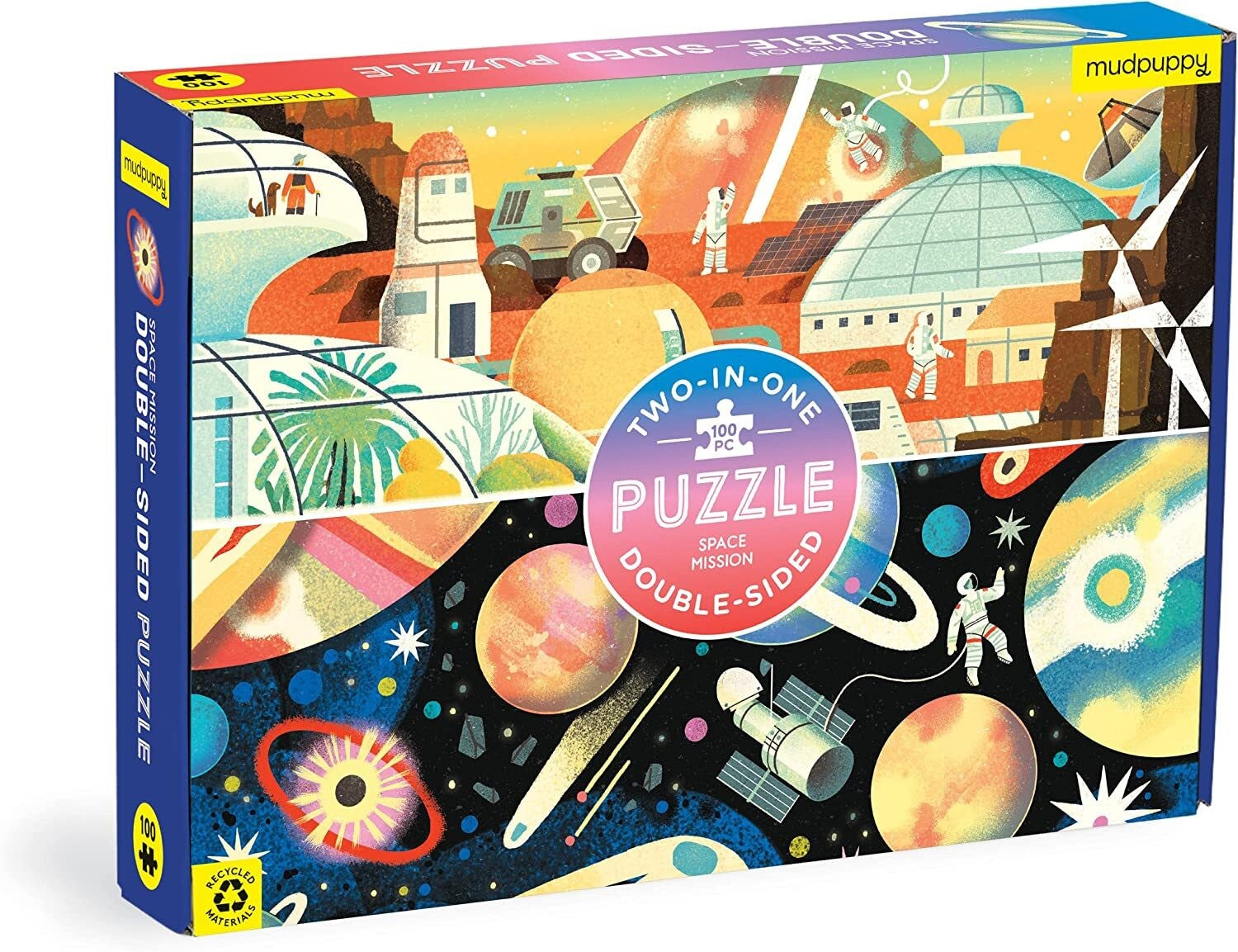 Mudpuppy's Space Mission Above & Below 100 Piece Double-Sided Puzzle features all things out of this world, land rovers and space stations on one side and planets and asteroids on the other. This two-in-one puzzle is a great family activity for adults and children to enjoy together. Puzzle pieces come packaged in a sturdy and easy-to-wrap box, perfect for gifting, reuse, and storage.