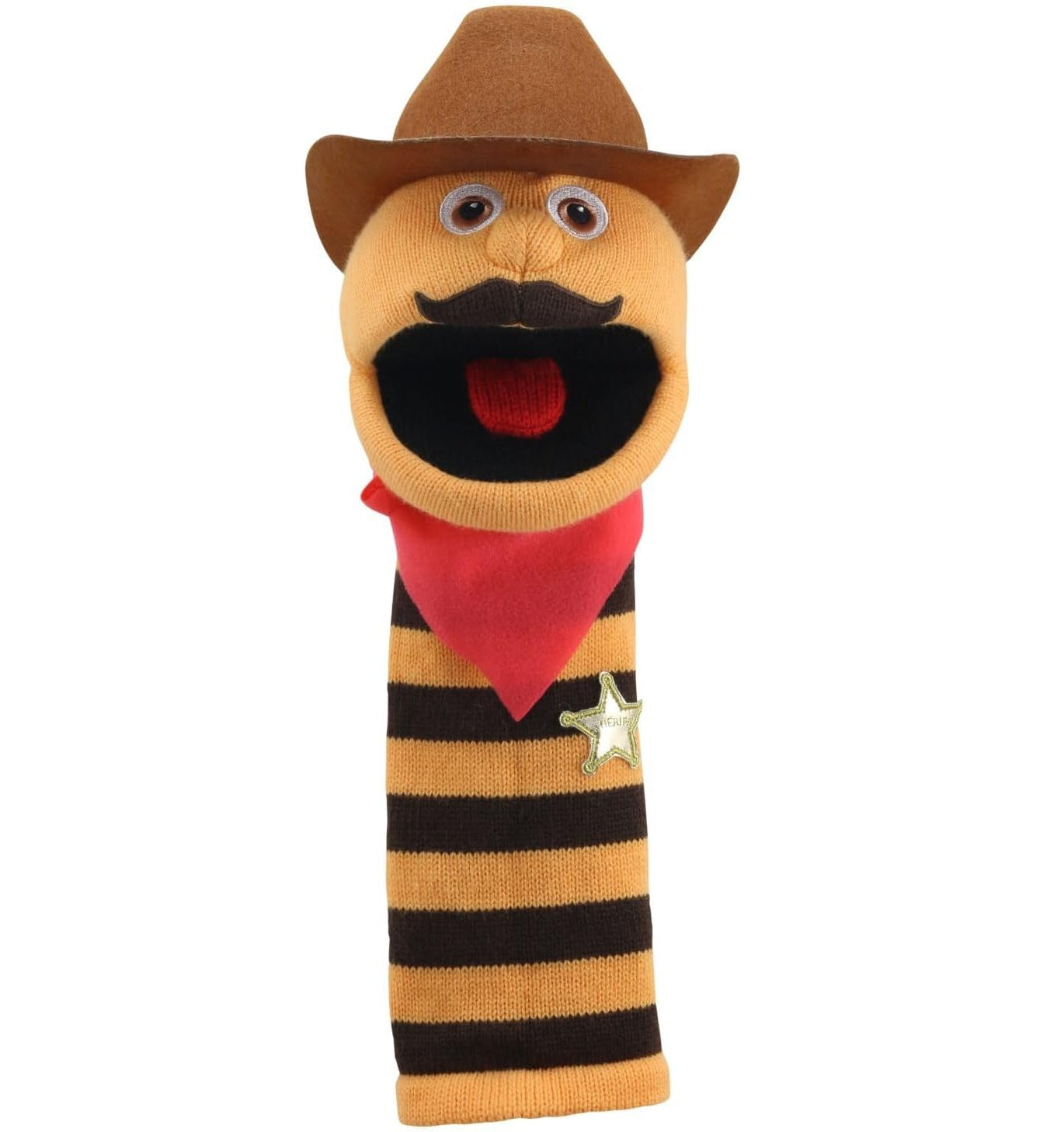 Meet the Cowboy! Complete with a fantastic hat, neckerchief, and shiny sheriff’s badge, this bright orange and brown stripy Sockette captures the spirit of the Wild West, bringing instant fun and excitement to playtime. Now made from recycled materials, he features embroidered eyes and a friendly face, making him a year-round favourite, loved by both adults and children!