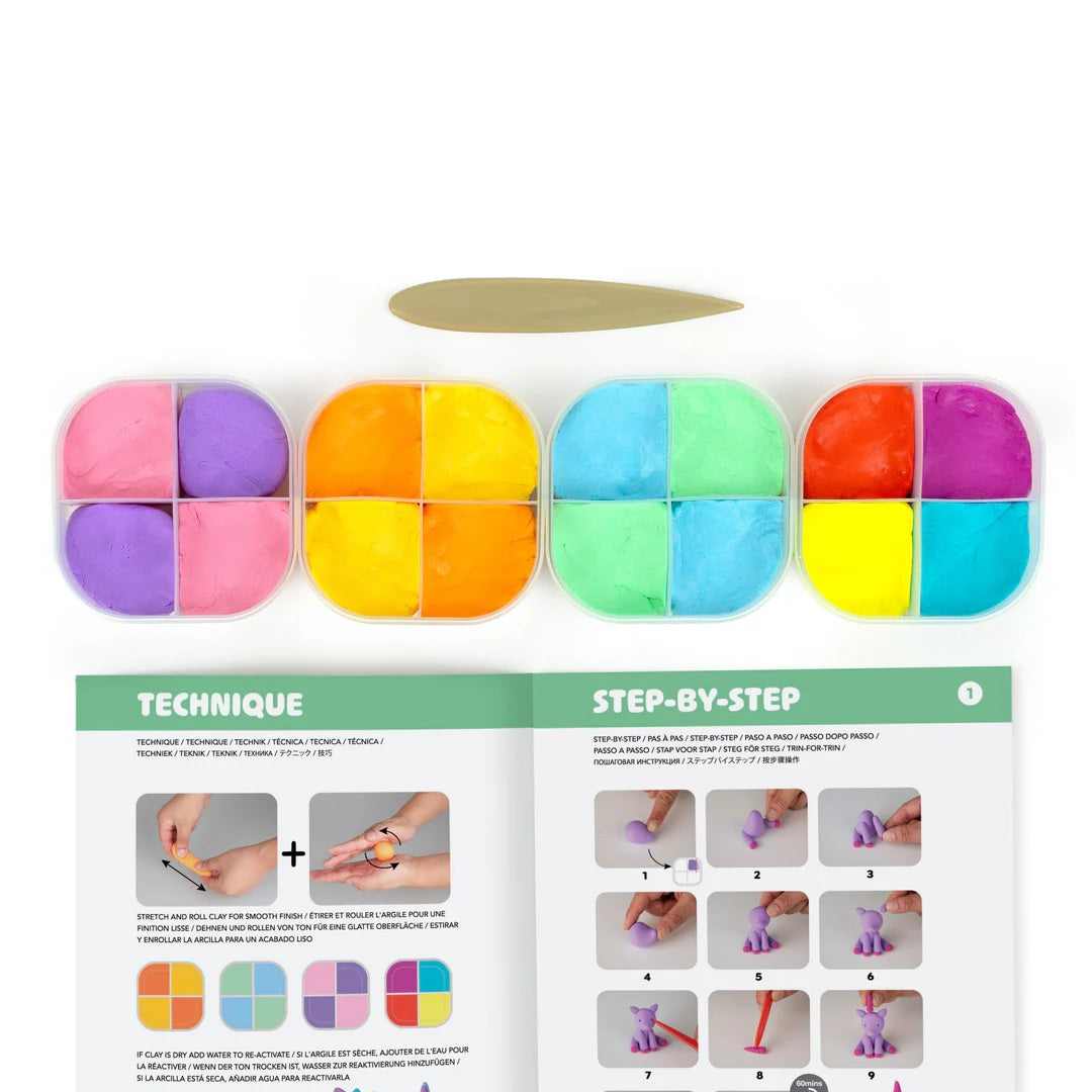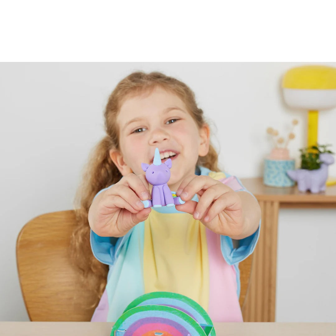 Includes: 10 colours (160g) of air-drying clay to make 6 unicorns, 1 sculpting tool, 2 pop-out accessory sheets, built-in play scene, visual instructions