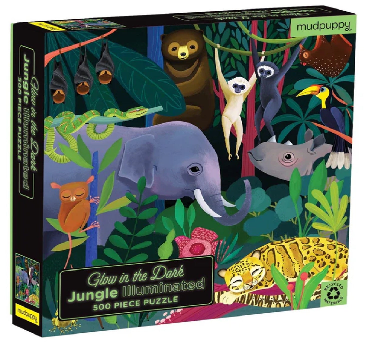 Piece together animals in the wild with Mudpuppy's Jungle Illuminated 500 Piece Glow in the Dark Puzzle. After you complete the puzzle, turn out the lights to see the nocturnal animals wake up!