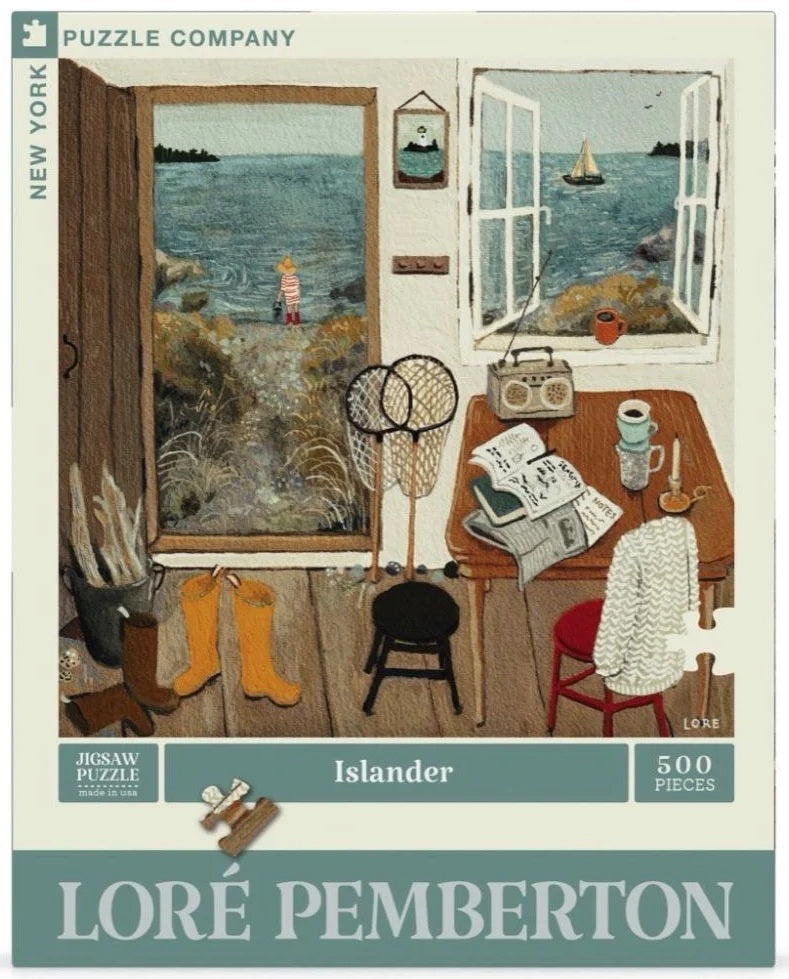 Step into a tranquil seaside retreat with Islander, a 500-piece puzzle capturing the essence of coastal life. This serene scene by artist Loré Pemberton invites you into a cozy cottage entryway, where fishing nets, tall rain boots, and driftwood gather near an open window. Through the doorway, a sailboat glides by as a woman stands along the shoreline, basking in the calm of the sea. With its inviting details, this puzzle is perfect for anyone who loves the quiet beauty of nautical life and makes a wonderful gift for the holidays.
