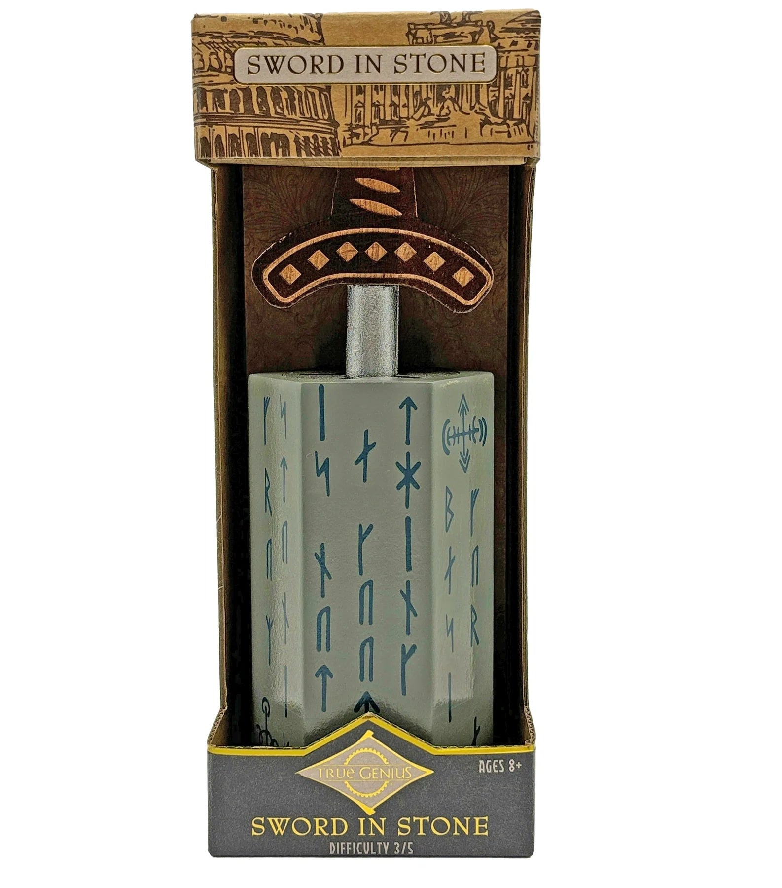 Inspired by the legend of a knight's quest for redemption in feudal Rome, this challenging puzzle brings a mythical tale to life. The story tells of a knight who attempted to demonstrate the difficulty of splitting stone with a sword but instead embedded his blade in the rock where it remained for centuries.